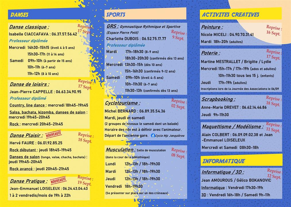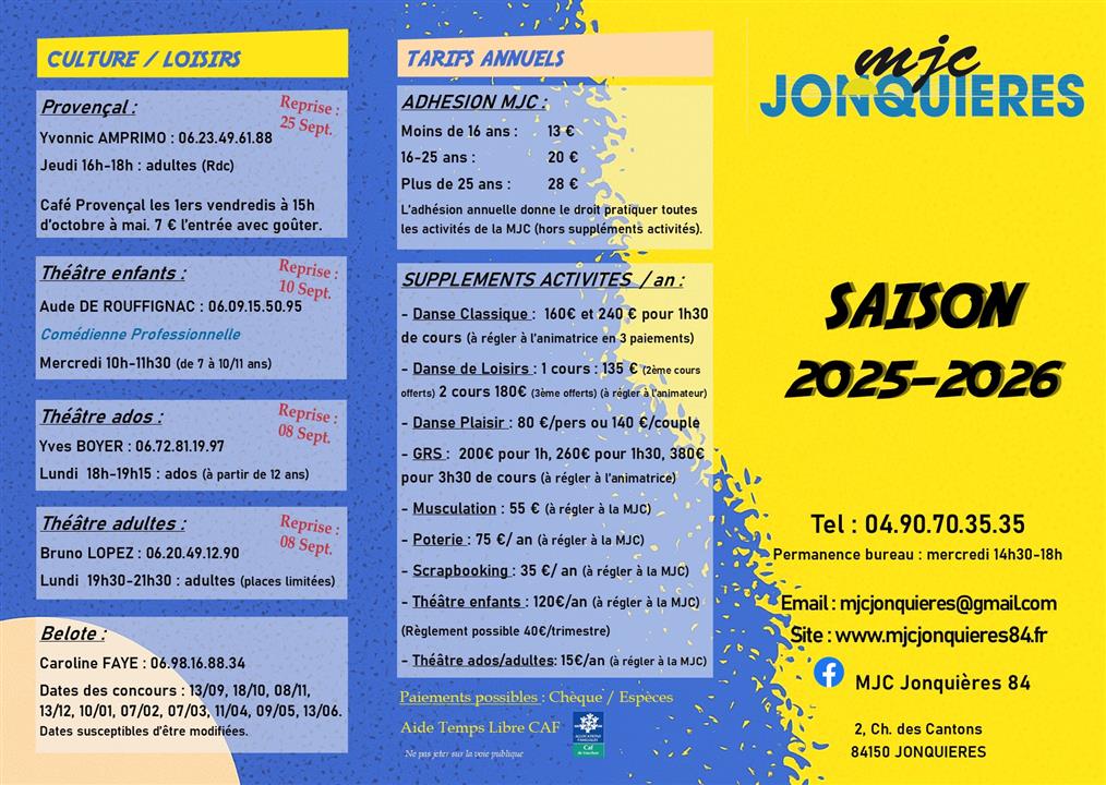 La Maison des Jeunes et de la Culture de Jonquières est un espace ou fusionnent la rencontre et l’épanouissement de ceux qui la fréquentent au travers de différentes activités, pour tous les âges, et ceux grâce à la mobilisation de nos animateurs bénévoles. C'est l'esprit de la MJC. Qu'ils soient remerciés de mettre leur talent à votre disposition.